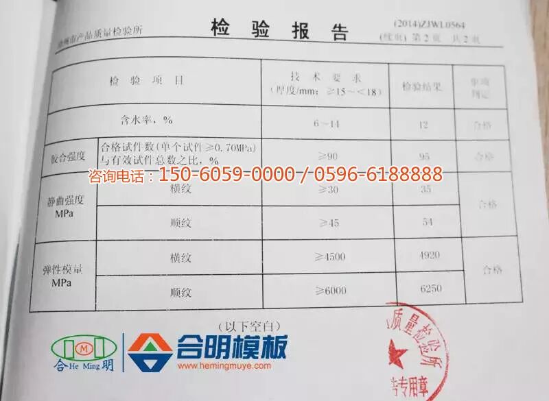 经漳州市产品质量检验所抽样检验,合明模板含水率适中,在检验标准范围内,胶合强度、静曲强度、弹性模量等检验数值均在标准之上,合明模板产品质量在合格模板产品标准之上。